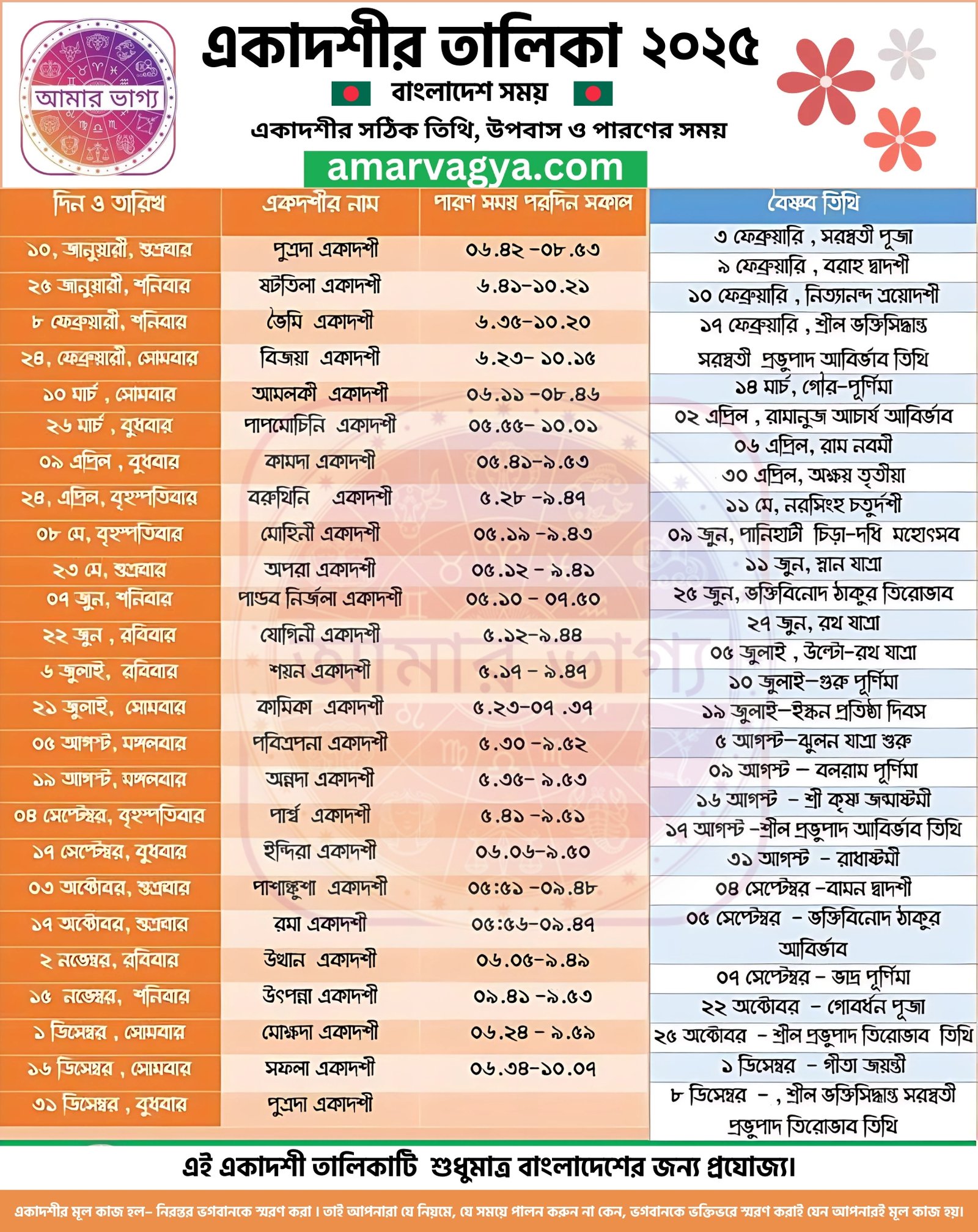 আজকের আয়োজনে ২০২৫ সালের একাদশীর তালিকা ও পারণের সময় প্রকাশ করা হলোঃ